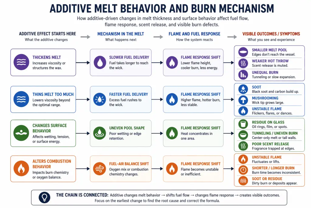 Troubleshooting often stops at the symptom list and leaves the mechanism unstated. The missing clue is that candle additives can change how melted wax moves to the flame, so weak throw, soot, residue, or an unstable burn may begin before you make a wick change. Viscosity is how easily melted wax flows, and a shift in viscosity can change both scent release and flame behavior. When the fuel moves differently, the candle can stop behaving like the earlier version even though it still contains the same wax, wick, and oil load.