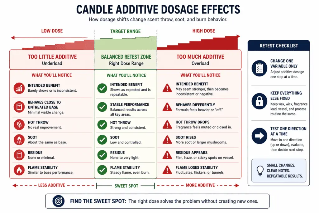 Additive dosage means how much additive is in the wax formula, not how much fragrance oil is in the candle. Underload means too little additive to do its intended job, while overload means enough additive to start pushing the formula toward weaker throw, more residue, soot, or a less steady burn. What counts as too much or too little is formula-specific, so poor burn performance here does not automatically mean you need a new wick plan. A dose that feels minor on paper can still be large enough to move the formula away from its last stable version.
