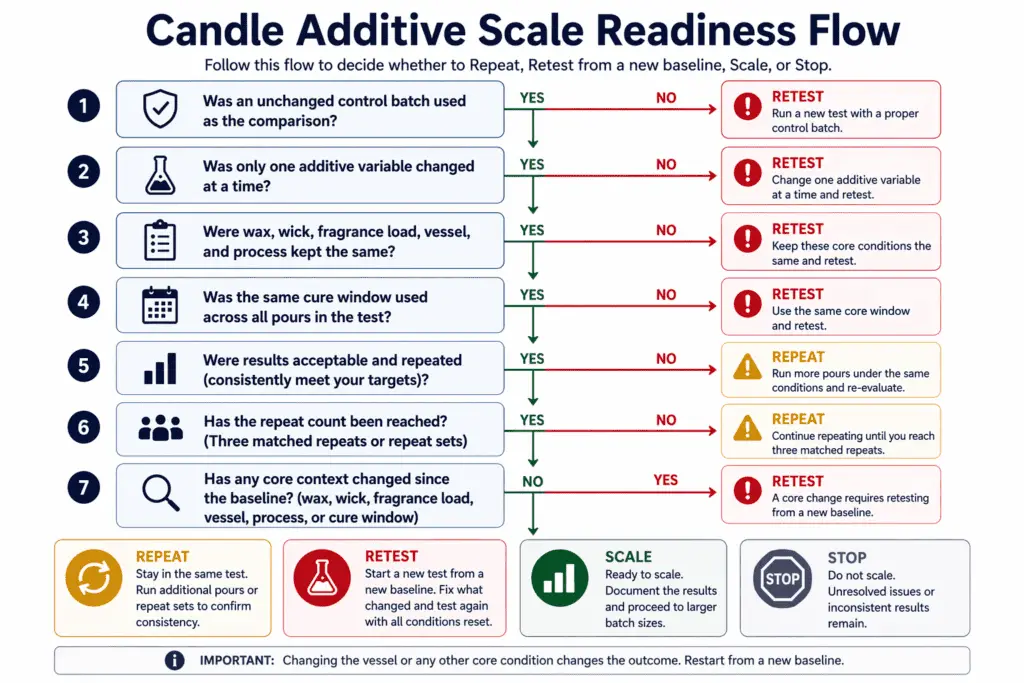 This matters because one good-looking result can still fail later. A smooth top or clean burn in one small round does not prove that the formula is ready for a larger batch if the result has not repeated. A good testing workflow closes with a go-or-no-go rule, not a leap of faith.
