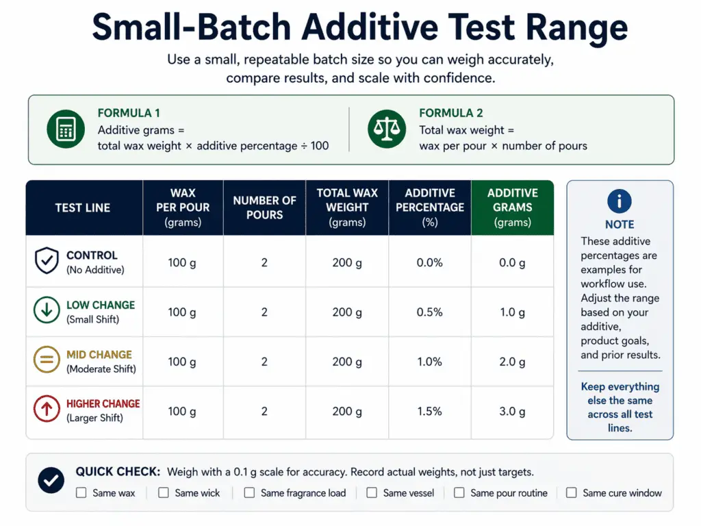 Test candle additives by pouring an unchanged control batch and one measured additive change at a time before repeating a successful formula at a larger batch size. Candle additive testing means comparing one unchanged formula with one formula that includes a single measured additive change. On this page, small batches before scaling up means measured mini pours used to validate one change before you repeat the same formula at a larger batch size. The goal is to judge appearance, scent, burn behavior, and repeatability without wasting full pours.